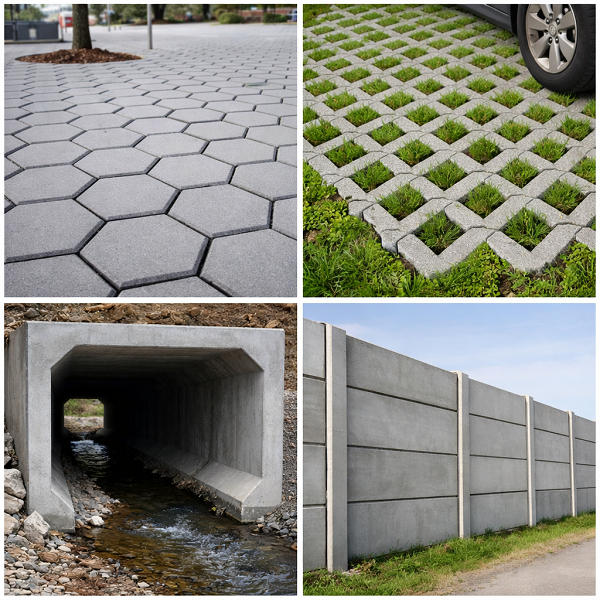 Material beton precast dirancang dengan dimensi yang presisi sehingga memudahkan perencanaan dan pemasangan. Produk seperti paving block hexagonal, paving grass block, box culvert precast, dan pagar panel beton tidak hanya berfungsi secara struktural, tetapi juga berkontribusi pada pengaturan ruang yang lebih efisien.
